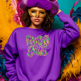 Stay cozy while celebrating Mardi Gras in this comfortable sweatshirt featuring a bold "Mardi Gras" script design. Ideal for chilly parade days or evening parties, this sweatshirt comes in vibrant Gold, Purple, and White.